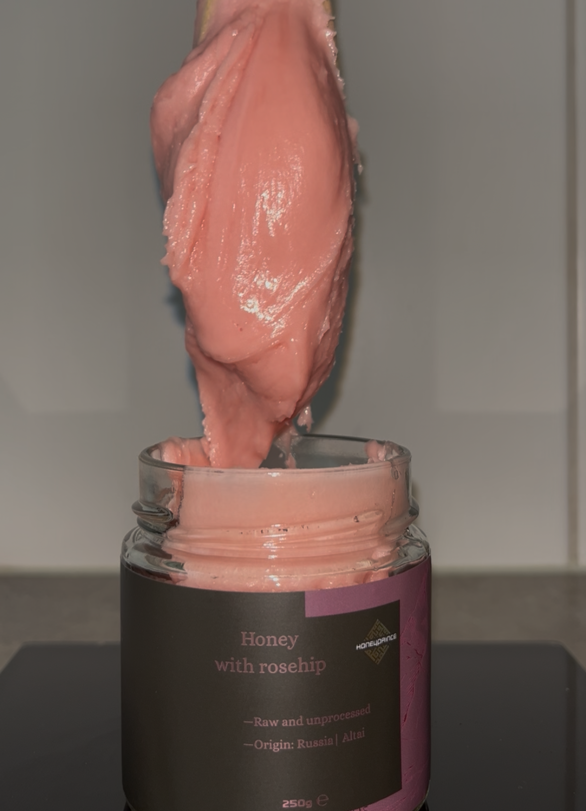 Unique honey from the Altai region in Siberia, Russia. This rare honey is produced by bees that collect nectar from various wild flowers in Siberia's Altai region. Two of these are borage and thistle. The honey is very rich in antioxidants, vitamins, minerals and amino acids. The pink color comes from a rosehip extract and is completely natural. Rosehips are known for their health-promoting properties and contain extremely high levels of vitamin C (up to 10-50 times more than citrus fruits).